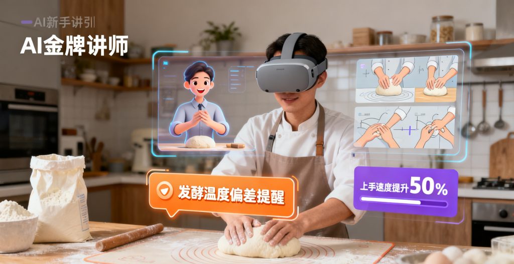 虚拟场景模拟面包制作、顾客沟通,新手师傅上手速度加快 50%,省去资深员工重复培训的精力。